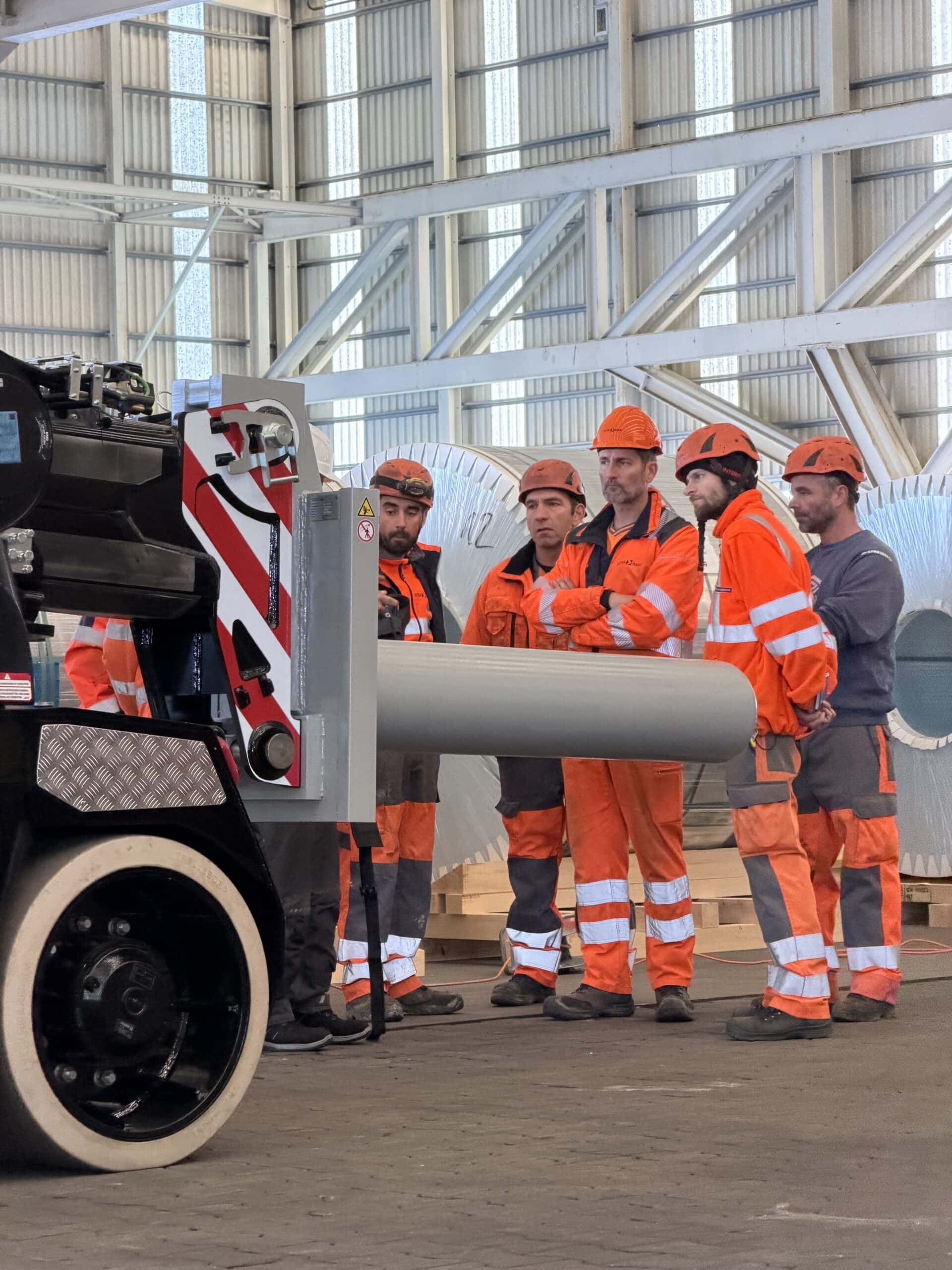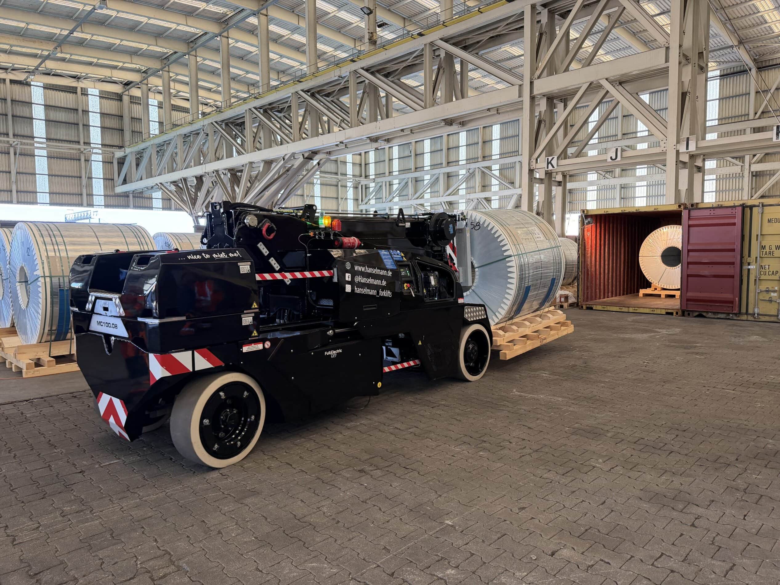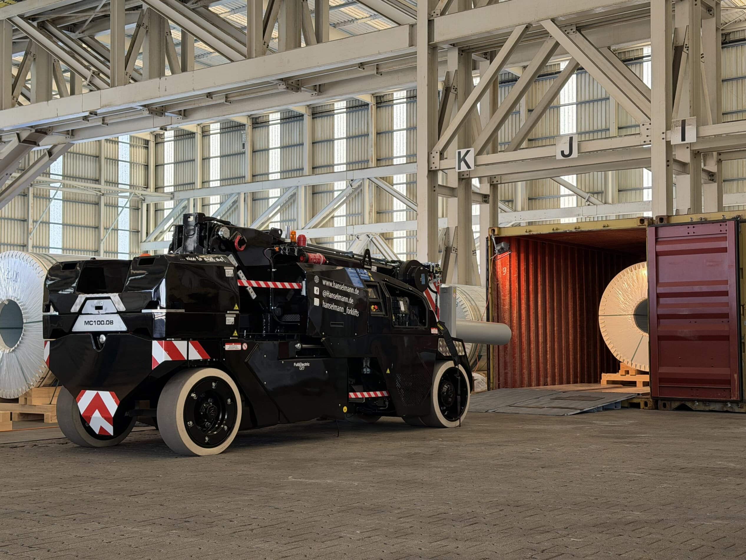 Die ideale Lösung lag in der High-End-Technologie von JMG: Mit unserem neuen Elektrokran JMG MC 100.08 – ausgestattet mit einer maximalen Tragkraft von 15 Tonnen auf den Gabeln – konnten wir die Herausforderung effizient meistern. Der Coildorn wurde individuell auf JMG Krane angepasst, belastbare Einfahrrampen gebaut und die Lastverteilung optimiert.